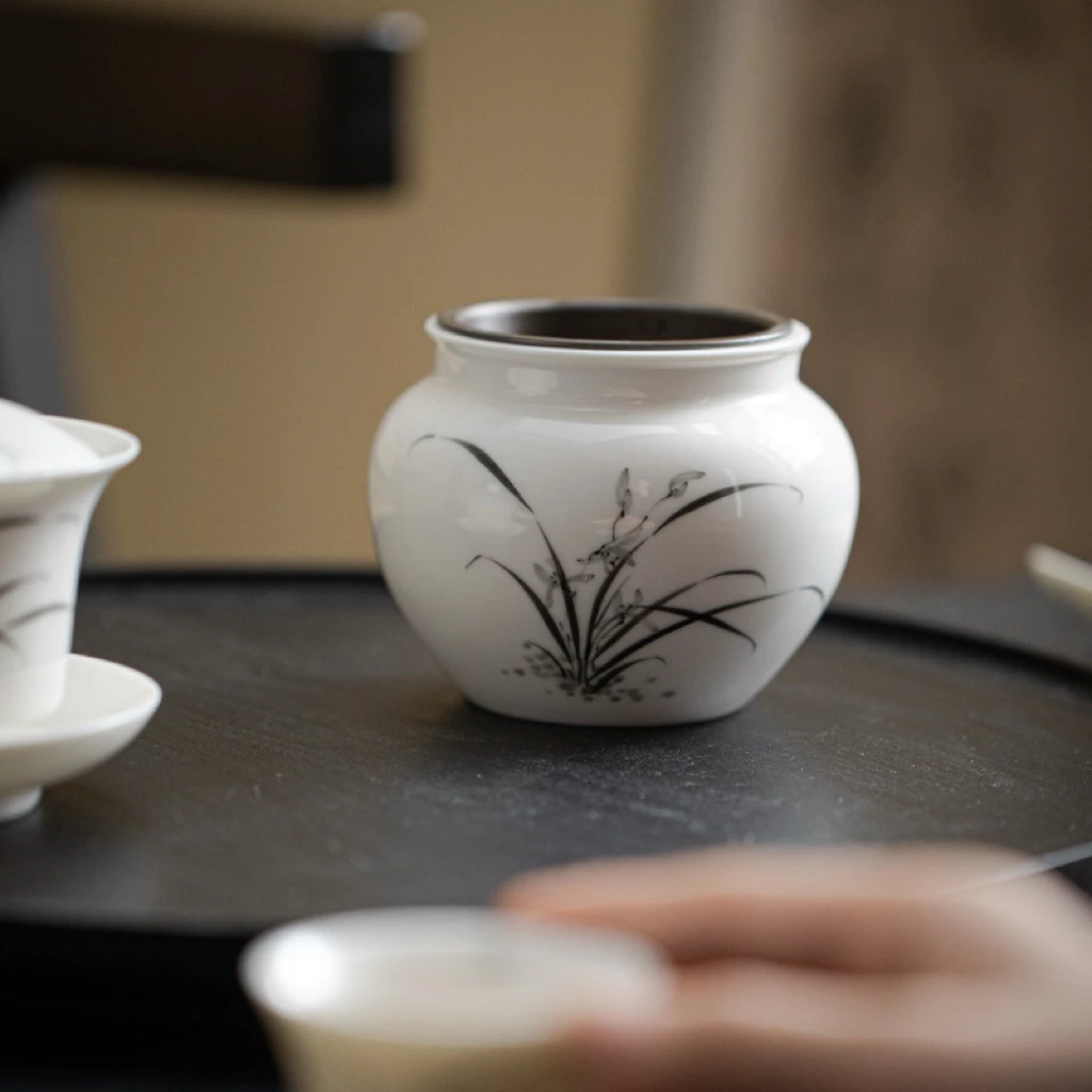 Chậu đựng bã trà họa lan thủ công kèm nắp là phụ kiện không thể thiếu cho không gian trà đạo – vừa tinh tế, vừa thực dụng, thể hiện phong vị thanh cao của người thưởng trà.